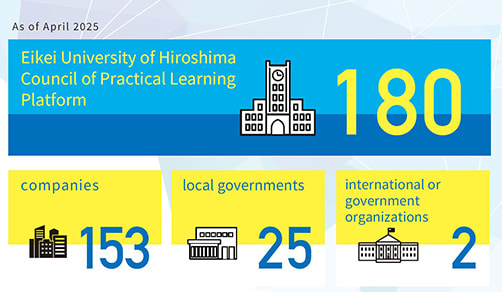 In collaboration with the Eikei University of Hiroshima Council of Practical Learning Platform, which consists of corporations, local governments, NPOs, international agencies, and other organizations cooperating in education at EUH, students learn practical skills through project-based learning (PBL) where they work to solve real-world problems faced by corporations or local governments, as well as experiential/practical programs such as internships and volunteering. Furthermore, as an initiative of the EUH Center for Partnership and Research Promotion, the Co-creation Project is underway to create new business for corporations participating in the Eikei University of Hiroshima Council of Practical Learning Platform. Students in their second year and later can participate in the Student Collaboration Project, where they team up with a corporation and receive support from faculty members with project management skills. Students can also practice the academic knowledge they have gained in society through other opportunities to make proposals and participate in EUH management in various ways.