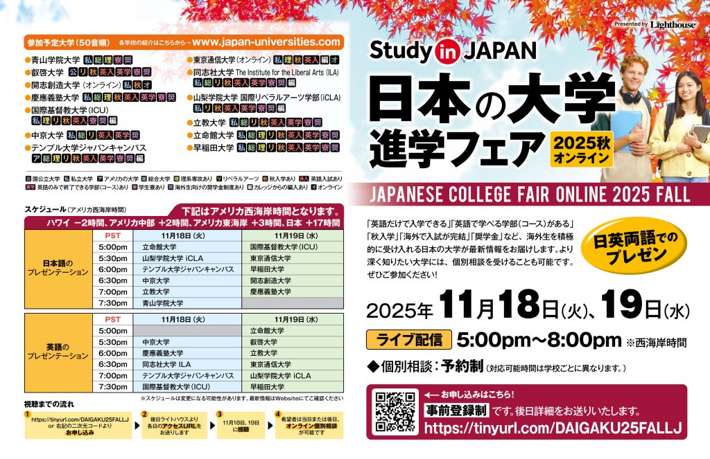 この度、下記日程でライトハウス主催の日本の大学 オンライン進学フェア2025秋に参加します。